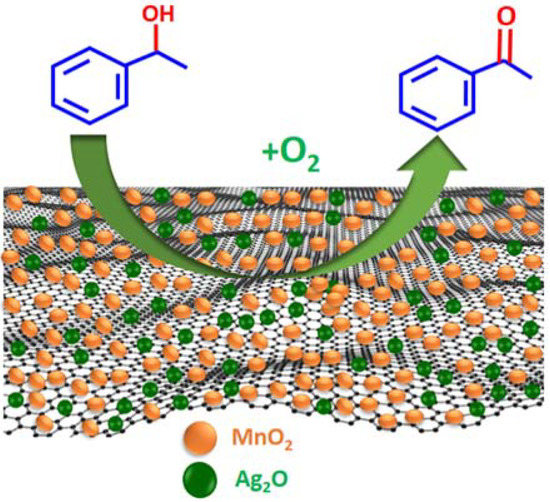 In connection with our efforts in the utilization of several metallic oxide NPs as effective catalysts for the liquid-phase oxidation of alcohols using oxygen [22,49,50], we compare between the catalytic efficiency of Ag2O NPs-doped MnO2 without using graphene support (HRG) and the catalytic performance after using HRG as a catalyst support toward the oxidation of 1-phenylethanol in order to understand the support effect (Scheme 1). The prepared nanocomposites were fabricated, and their catalytic performances examined in aerial oxidation of alcohols via ideal green methodology, i.e., using a green oxidizing agent while being free of any base or surfactants. The as-obtained nanocomposites have characterized by XRD, TGA, SEM, EDX, HRTEM, BET, Raman, and FT-IR.