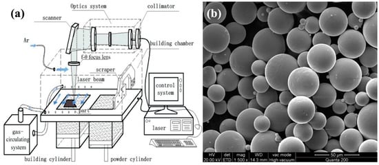 Principles, devices, and materials for selective laser melting (SLM)-based 3D metal printing: (a) illustration of SLM fabrication (reproduced from [], with permission from Elsevier, 2018); (b) Ti-6Al-4V powder viewed by scanning electron microscopy (SEM).