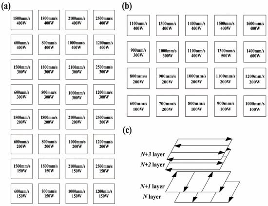 A full-factor experiment was performed to obtain the optimal combination of parameters including laser power, scanning speed, layer thickness, scanning spacing, and laser spot size. Modifiability of these parameters was considered jointly, and the influence of each factor on SLM fabrication quality analyzed. Laser power “P” and scanning speed “V” were selected for studying the influence of the process parameters on the surface quality of the SLM-fabricated titanium alloy. Experimentation on the fabrication process consisted of an early stage (I) of large-range exploration and a late stage (II) of range refinement. In the early stage (I), the range was 150–400 W for laser power and 600–1600 mm/s for scanning speed, as shown in Figure 2a. According to the forming effect during stage (I), we refined and optimized the selection of parameters in order to reduce the complexity of the experiment. The narrow scanning speed range was more sustainable for optimizing parameters, and we got stage (II) building parameters. The late stage (II) of range refinement is shown in Figure 2b. In the experiment, the block size was 10 mm × 10 mm × 10 mm, 25 μm for layer thickness, 0.08 mm for hatch spacing, and scanning mode was S-shaped orthogonal scanning. In addition, following the layer thickness of 25 µm, layer thicknesses of 30 µm, 35 µm, 40 µm, and 45 µm were also used to get an optimized processing window. The principles of the fabrication are presented in Figure 2c.