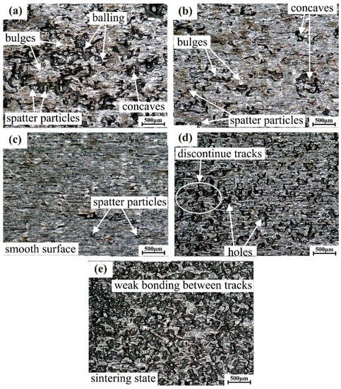 The surface morphology of parts fabricated under different parameters was observed using the VHX-5000. The observed results can be classified into five categories (i.e., severe over-melting zone, high energy density nodulizing zone, smooth forming zone, low energy density nodulizing zone and sintering zone, which can be found in Figures S1–S5 in the Supplementary Material), as shown in Figure 3. It can be seen that these regions are very distinct. The serious over-melting zone is characterized by serious distortion, roughness, and some nodulizing at the surface of the parts, as seen in Figure 3a. Its typical parameters are P = 150 W for laser power and V = 600 mm/s for scanning speed. For the high-energy density nodulizing region, the surface of the parts become smooth with slight nodulizing, but there were still irregular bulges and concaves, as seen in Figure 3b. Its typical parameters were P = 150 W for laser power and V = 700 mm/s for scanning speed. For the smooth forming zone, the surface was smooth with continuous tracks, ideal overlapping, and elimination of nodulizing, as shown in Figure 3c. Its typical parameters were P = 150 W for laser power and V = 800 mm/s for scanning speed. For the low-energy density nodulizing zone, the track at the surface of the parts was not continuous, and melting status was poor, leading to the presence of some holes between tracks. Moreover, some powders were not melted at the surface, some ball-shaped bulges were present, and the upper surface of the parts was coarse and void of metallic lustre, as shown in Figure 3d. Its typical parameters were P = 150 W for laser power and V = 1000 mm/s for scanning speed. For the sintering zone, the surface of the parts lacked metallic lustre, the track was not continuous, and most of the powder was sintered, as seen in Figure 3e. Note the surface appears sandy with weak bonding strength between tracks. Its typical parameters were P = 150 W for laser power and V = 1100 mm/s for scanning speed. Visual results indicate that nodulizing was present in both the high-energy (Figure 3b) and low-energy density nodulizing zones (Figure 3e), this result confirms the conclusions in References [,]. In addition, close observation of the results reveal that spatter particles were inserted into the track-overlapped surface of all samples.