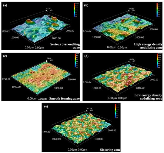 Furthermore, in order to fully show and distinguish the five categories of surface, the roughness and 3D surface morphologies are shown in Figure 4. Note that for software reasons, in Figure 4, the peak of the parts is the bottom of the 3D surface morphology, and vice versa. In addition, on the Z-axis, the origin begins from the bottom of the 3D surface morphology. In Figure 4a,b, it can clearly be observed that the proportion of smooth formed tracks increased first and then decreased. As mentioned above, the bulges including ballings and concaves which were generated due to high-energy density, led to the broken scanning track. The key difference between the serious over-melting zone and high-energy density nodulizing zone is the area of normal forming plane and the depth or height of defect. Except for the height as shown in Figure 4a,b, the average roughness values Ra of multi-group samples were 20.91 μm and 16.82 μm. More smooth tracks would reduce the roughness. But in the parameter window, the roughness could not be a sufficient condition for strictly classifying the forming zones. Because of some unmeasurable defects, the reliability of roughness was weakened. In the actual exploration of processing parameters, the comprehensive evaluation method is necessary. Similarly, the incomplete melting causes the holes and breaks in the track. There is little regular big concaves or bulges in the low-energy density nodulizing surface and sintering surface, which is significantly different from the serious over-melting zone or high-energy density nodulizing zone. Considering surface roughness, the average measured values of Ra in the low-energy density nodulizing zone and sintering zone were 20.37 μm and 14.51 μm, respectively. It seems that the normal forming plane would increase the surface roughness. But in fact, the area of normal forming surface in the low-energy density nodulizing zone was bigger than that in the sintering zone. The sintered state of breaking tracks with a small thickness decreased the surface roughness. The accumulation of holes and breaking tracks exacerbated the quality of the surface.