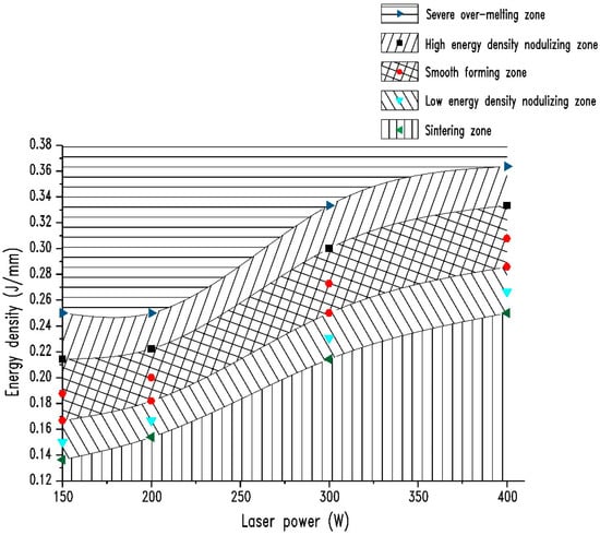After inspecting and summarizing the surface morphology of all square parts obtained from the full-factor experiment, the SLM-fabricated titanium alloy’s surface was classified into five zones (i.e., severe over-melting zone, high-energy density nodulizing zone, smooth forming zone, low-energy density nodulizing zone, and the sintering zone). Based on Equation (1), the fabricating parameters in the experiment were converted into linear energy density. According to their respective surface morphology, all fabricating parameters were allocated to a corresponding zone. Statistical data from the experiment was utilized to compute the linear energy density of each zone, with laser power “P” as the abscissa and linear energy density “ψ” as the vertical coordinate. Given a layer thickness of 25 μm, the results and the relationship between the energy input and the forming zone is plotted in Figure 5. From this figure, it can be deduced that for SLM-fabricated titanium alloy, the range of linear energy density is not constant. Rather, it varies with laser power (scanning speed). For the smooth forming zone, the range of linear energy density varied from 0.17 to 0.22 J/mm at low laser power (150~200 W), 0.23~0.26 J/mm at P = 300 W, and 0.27~0.29 J/mm at P = 400W. Therefore, the linear energy density was not linearly related to the quality of the formed surface. The traditional belief that setting the linear energy density appropriately can necessarily guarantee surface quality is incorrect. It is also incorrect to establish direct correspondence between energy input and quality of surface formation. On the evidence of Figure 5, after limiting the fabricating parameters to the smooth forming zone, the efficiency of laser forming can be improved by increasing laser power or scanning rate.