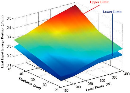 Samples obtained at a layer thickness of 30 µm, 35 µm, 40 µm, and 45 µm were similarly analyzed. The relationship with varying layer thickness between laser energy input and parameter is plotted in Figure 6. Given a layer thickness of 25 µm, 30 μm, 35 μm, 40 μm, and 45 μm, the fabricating parameter windows of the smooth forming zone are shown in Figure 6. It can be seen that for a given layer thickness, the linear energy density of the smooth forming zone varies in the same way with increasing the laser power P. That is, the upper and lower limits of the linear energy density of the smooth forming zone increased by a large margin. Moreover, the two limits of the smooth forming zone also increased considerably with layer thickness. This can be attributed to the fact that if the quantity of powder in a layer increases, greater energy input density is required to melt the powder in order to obtain a satisfactory track and quality of formation. Therefore, the quality of SLM-fabricated titanium alloy can be guaranteed by limiting the fabricating parameters to the range of the smooth forming zone, or choosing the fabricating parameters based on the windows in Figure 6.