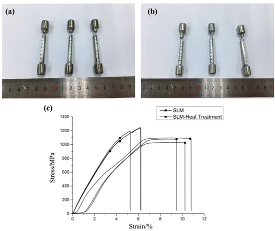 Testing of tensile properties: (a) tensile bars with no heat treatment; (b) tensile bars with heat treatment; (c) strain–stress curves of Ti6Al4V alloy.