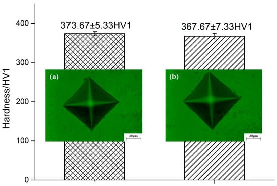 The three groups of micro-hardness samples were formed by the same optimal parameters of tensile pieces, and the heat treatment parameter was also the same. Five testing points were taken on the surface of each sample for micro-hardness testing. The spacing of the test points was 2 mm, and the results of micro-hardness are shown in Figure 8. Figure 8a is the sample without heat treatment, and Figure 8b is the sample after heat treatment. The comparison found that the surface indentation side length (D1 ≈ D2 = 72.8 μm) of the no heat treatment’s sample surface was slightly smaller than that of the surface indentation of the sample surface after heat treatment (D1 ≈ D2 = 73.5 μm). The average micro-hardness value of the upper surface of the SLM directly-made Ti6Al4V alloy was 373.67 ± 5.33 HV1. After the heat treatment, the average micro-hardness value was measured at 367.67 ± 7.33 HV1. Wang et al. [] chose a 1000 mm/s scanning speed to build a specimen with a hardness of about 400 HV. Vilaro et al. [] found that the sample was annealed at 800–850 °C, and the hardness decreased by about 20 HV after cooling, which was closely related to the precipitation of α phase. Moreover, the hardness can be reduced by about 35 HV when annealing at 875 °C [], although the hardness of the sample was slightly reduced after heat treatment.