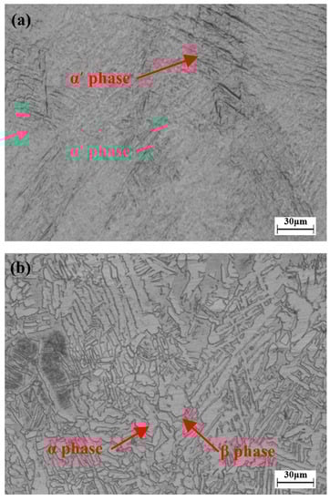 The microcosmic structures of the SLM-fabricated titanium alloy following heat treatment were inspected, as shown in Figure 9. Morphology of the alloy’s microcosmic structure along the direction of laser scanning in the X–Y plane without heat treatment is presented in Figure 9a. It can be observed that prior to heat treatment, it consisted mainly of acicular martensite α’ and β phases. The reason for this is that during rapid cooling of Ti6Al4V, and new columnar β crystals formed. Before diffusion can occur, the alloy elements are converted into an oversaturated solid solution which has the same composition of the parental phase but with a different crystal structure (i.e., α’ phase martensite). It can be seen from Figure 9a that the acicular martensite α’ phase exists in abundance. Note that martensite is principally characterized by high strength and hardness. Its ductility and tenacity are dependent on the substructure of martensite (lath martensite is superior to acicular martensite in tenacity). Therefore, SLM-fabricated Ti6Al4V features high strength and low elongation prior to heat treatment. As shown in Figure 9b, the α’ phase grows tremendously and is dispersed in the β phase after recrystallization and annealing. The reason is that when the heat treatment temperature approximates to the β phase conversion temperature, β phase nucleation occurs along the boundary of the α’ phase. The closer the temperature is to the phase change temperature, the higher the content of the β phase. As the acicular martensite α’ phase converts into the layered α+β double-phase structure, the material’s elongation improves accordingly. The above results can also explain the reason why micro-hardness of SLM-ed Ti6Al4V alloy had a slight decline after heat treatment; it is due to the fact that SLM-ed Ti6Al4V microstructures were composed of the brittle and tough acicular α’ phase martensite. However, the α’ phase martensite would change to a layered α+β double-phase and it leads to the micro-hardness decline. Sallica-Leva et al. [] also studied the malleability of SLM-fabricated titanium alloys using different heat treatments and concluded that the α’ phase decomposition is critical to improvements in malleability, which proves our findings in this experiment. After analyzing fracture morphology of the SLM-fabricated titanium alloy Ti6Al4V, it is revealed that due to heat treatment, many deeper dimples were uniformly distributed across a large area within tensile fractures of the parts. It further confirms the conversion of the fabricated titanium alloy from quasi-cleavage fracture to ductile fracture.
