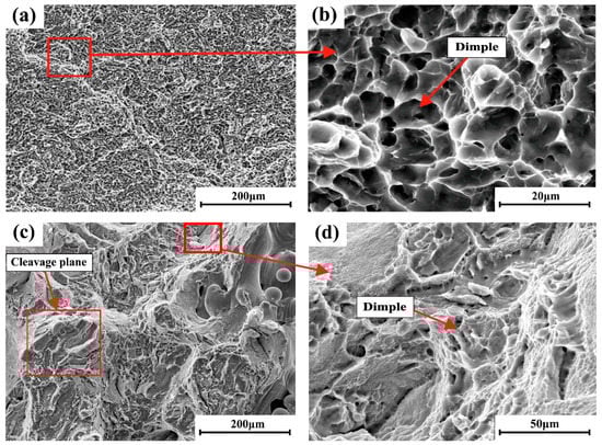 SEM images of fracture morphology of tensile testing: (a) thermally treated sample (500×); (b) thermally treated sample (5000×); (c) as built sample (500×); (d) as built sample (2000×).