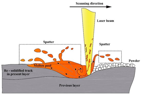 Figure 3 and Figure 4 show that, except for the smooth forming zone, the surface morphology of the other zones all had defects. Track deformation and concavity occurred within the over-melting zone. The reason is that the high density of linear energy input lengthens the cooling and solidification process of the track. As a result, the melting pool absorbs the powder at both sides more easily, leading to convexity. The convexity at the initial layer will not cause defects or other adverse influence on the fabrication of parts. But it does affect powder coating at the next layer. This problem deteriorates in subsequent layers and may well cause failure of the fabrication process. Spattering happens throughout the process, and its generated principle can be depicted, as Figure 11 shows, where one can see several types of spatter which formed during laser interaction with powder. As discussed in [], particle spattering was mostly attributed to recoil pressure caused by instantaneous melting or even steaming of laser and powder. Another reason is that gas in the powder that is rapidly heated results in instantly swelling volume, propelling the powder to the solidification layer. Spattered particles are inserted at the surface or interior of the SLM-fabricated parts, reducing the quality of the powder coating in addition to the density and performance of the fabricated parts. As for the low-energy density nodulizing zone, there are both non-melted powder and ball-shaped bulges at the surface. The reason for this is that the linear energy density is so low that some powder does not have enough time to melt, and wettability of the liquid track is insufficient for the already solidified zone. At the surface of the sintering zone, almost no track is formed and the powder is mostly sintered.