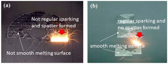 Surface morphology and sparking of two typical SLM fabrication processes: (a) rough surface without regular sparking and spatter formed; (b) fine surface with regular sparking and no spatter formed.