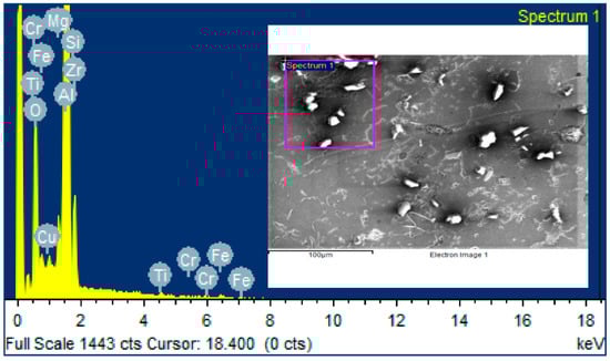 Both scanning electron microscope (SEM) and optical microscope images were captured to study its micro structure and to find an out dispersion of ZrO2 reinforcement particles along the AA6061 matrix alloy. Scanning electron microscope and optical image helped to find second phase elements in the developed composite, as shown in Figure 1a–c. The optical images exhibited the distribution of ZrO2 particles in the matrix phase. An agglomeration of particles was seen in the SEM images. This attribute was due to the improper dispersion and mixing of particles in the metal matrix phase. This agglomerate will fall during the machining process as the metal matrix phase fails to hold the reinforcement particles. This paves the way for pores in the cast composite. This agglomerate or cluster formation has a direct effect on hardness value. The clusters were due to the increased wt % of the ZrO2 particles (i.e., 15%). This microstructure analysis confirms that wt % of reinforcement particles above 10% may cause property degradation and cause the poor surface finish. Scanning electron microscope images clearly show the size and shape of the ZrO2 particles and with the help of an indicated scale in the images, the sizes of the particles were clearly measured, and it was an average of 20 microns. Energy-dispersive X-ray spectroscopy (EDS) identifies and confirms the presence zirconium, aluminium, and oxygen. Table 2 shows the weight of composition of AA6061/ZrO2. Figure 2 shows the list of elements present in the developed composite. The wt % of elements as per EDS analysis was oxygen (29.2), aluminium (6.2), and zirconium (0.11). The main constituent of AA6061 alloy is aluminium, and ZrO2 is zirconium and oxygen. As the EDS spectrum concentrates on the matrix part, and few ZrO2 particles were present within the selected area, the amount of zirconium detected was low. Furthermore, Fe and Cr content were high in EDS due to the mild steel stirrer which was used to stir the molten material. Not always, but in rare cases during stirring, the hard ZrO2 particles impinge on the mild steel blade which causes removal of material. This removed material from the stirrer blade pooled with molten material and caused an increase in Cr and Fe content, as detected in Figure 2.