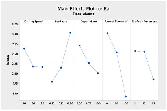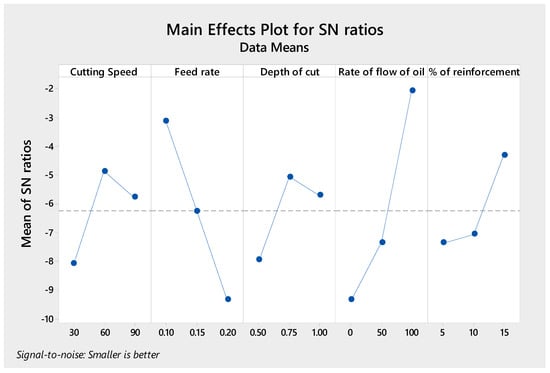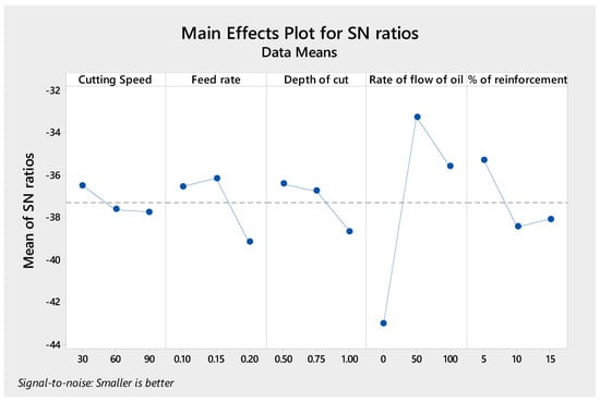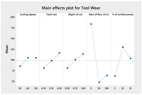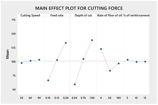 The main effects show the trend of factors on response, which is cutting force. Figure 8 shows the main effect plot for cutting force. From the graph, it is clearly understood that to obtain minimum cutting force value, the levels of factors considered should be A1, B1, C1, D2, and E2. This sequence is in line with all theory and other research outputs. As for percentage of reinforcement (E2), when percentage of reinforcement increases, it mostly leads to high cutting force because it is always difficult to machine when hard ceramic particles come in contact with tools. Tools need to be judicially selected by considering the type and hardness of work piece material, but in the case of composites, the nature of reinforcement particle needs to be taken into account. Rate of flow did not have much influence (i.e., 50 mL/h or 100 mL/h), but dry machining (0 mL/h) caused an increase in cutting force due to frictional force. This concept has been agreed upon by many researchers [].