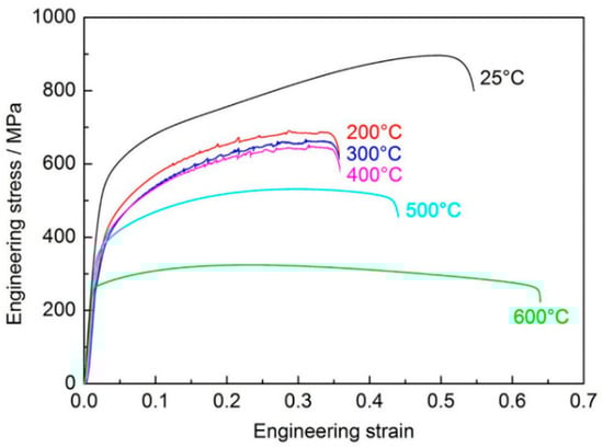 Figure 1 shows engineering stress-strain curves of the experimental steel at different tensile test temperatures. The statistical results of ultimate tensile strength (UTS), total elongation (TEL), and the product of ultimate tensile strength and total elongation (PSE) of the experimental steel at different deformation temperatures are summarized in Table 1. Combining Figure 1 and Table 1, it may be noted that the deformation temperature has a significant influence on the mechanical behavior of the investigated steel. The thermal softening effect is obvious with the increase of temperature. The UTS and PSE continuously decreased with the increase of temperature from 25 to 600 °C, a behavior similar to the results of Shterner et al. []. The TEL decreased from 55 to 36%, as the temperature increased from 25 to 200 °C. Interestingly, TEL remained almost unchanged at 36%, when the deformation temperature was in the range of 200 to 400 °C. Then, TEL increased from 36 to 64% with increase of tensile test temperature from 400 to 600 °C.