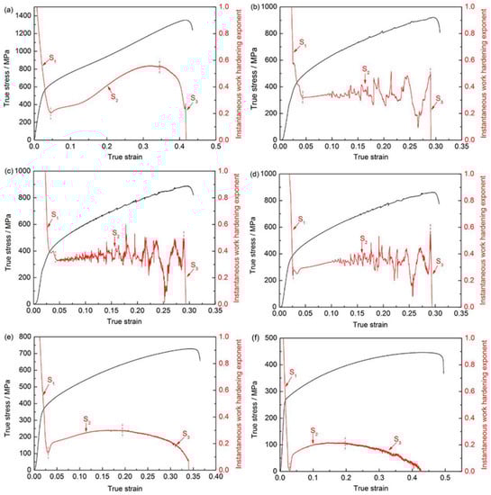 Instantaneous work hardening exponent (n) and true stress versus true strain of the experimental steel after deformation at different temperatures of (a) 25 °C; (b) 200 °C; (c) 300 °C; (d) 400 °C; (e) 500 °C; and (f) 600 °C. (S1~S3 mean stage 1–3).