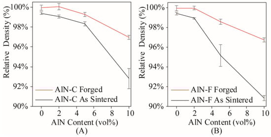 Data on the density of samples before and after TMP are shown in Figure 2. The Base, 2C, and 2F compositions were sintered to near-theoretical (99.0% or better) densities. Hence, these relatively minor additions of AlN did not interfere with the sintering-induced densification behavior of the material to any meaningful extent. However, greater AlN contents, as exhibited by 5C, 10C, 5F, and 10F, proved that the as-sintered densities were measurably reduced through higher ceramic additions. Furthermore, the matrix alloy appeared to be more sensitive to the finer particle size AlN-F ceramic. In this sense, whereas 5C sintered to 98.4% of its theoretical potential, 5F only reached 96.1%. At higher concentration, density values are further compromised in a comparable fashion; 92.8% and 90.8% for 10C and 10F, respectively.