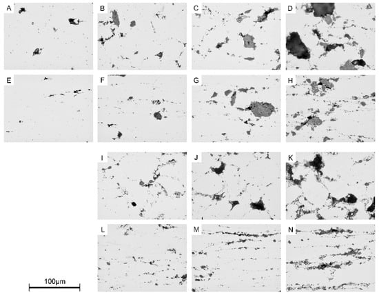 Hot worked microstructures are also shown in Figure 3; the base alloy (E) is contrasted by increasing concentration of coarse (F–H) or fine AlN additions (L–N). In all cases, the micrograph orientation is such that the loading direction was vertical. The Base alloy (Figure 3E) exhibited pore closure consistent with the direction of applied force. Similarly, prior particles were elongated in the direction transverse to this; prior particle boundaries were considerably less distinguishable than the as-sintered base material. Unidentified secondary phases appear as dark gray features in these micrographs.