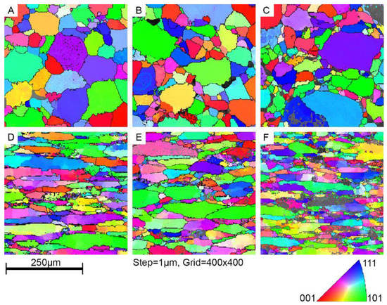 EBSD map of (A) Base, (B) 2C, and (C) 5C in the as sintered condition as well as variants deformed at 500 °C and 0.005 s−1 for (D) Base, (E) 2C, and (F) 5C. TMP direction vertical with respect to page orientation.