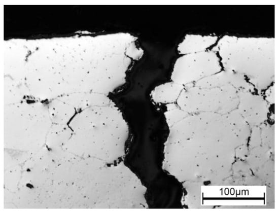 Typical appearance of cracks present at the circumference of select products after TMP. Sample 2C processed at 500 °C and 5 s−1. TMP direction was normal to the plane of the image.