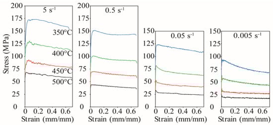 Flow stress (true stress—true strain) curves for alloy 2C developed during TMP at temperatures of 350 °C to 500 °C and strain rates of 5 s−1, 0.5 s−1, 0.05 s−1 and 0.005 s−1.