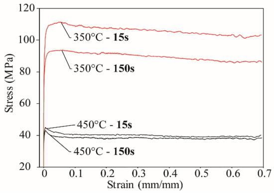 Further proof of the influence of DPN was devised through the elongated isothermal hold tests of Figure 7. The corresponding DSC trace of 2C in the T1 condition has been previously studied by the authors []. Upon heating to 350 °C and prior to deformation, the material has gone through several microstructural events, most notably static precipitation of the Type-I and/or Type -II S phase (DSC event peak at approximately 320 °C) []. Extended thermal exposure at 350 °C thereby fosters the growth and coarsening of all pre-existing precipitates present. These coarser precipitates provide less resistance towards dislocation motion. Both 15 s and 150 s holds at this temperature exhibit ongoing work softening at approximately the same rate, indicating that in both instances, precipitate growth (DPN) remains operative. At ~375 °C, dissolution of the S phase precipitates commences. This reaction then continues until a temperature of approximately 505 °C. Throughout this event, strengthening precipitates are dissolved into the matrix to a progressively greater extent. In the relative absence of precipitates, the flow stress behavior of both samples processed at 450 °C naturally converged, although the sample with extended hold time did show a marginally lower flow stress. As strain increased, the flow stresses remained different by approximately 1 MPa to 2 MPa. It is notable that the effects of solute drag as a result of this dissolution event are anticipated to be minimal as demonstrated in a study on a chemically comparable 2xxx series alloy [].