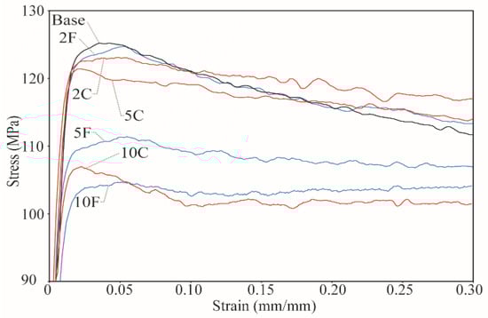 Aside from DPN, ceramic content also influenced the peak flow stress. This was particularly acute at low strain values, as a definitive trend with the MMC composition emerged. For instance, as shown below in Figure 8, peak flow stresses were consistently higher in MMCs that were relatively lean in ceramic content but declined proportionately as the ceramic content increased. Such transitions were somewhat counter-intuitive to what may be expected through the addition of a rigid phase, as reported for other aluminum MMC systems []. However, it was consistent irrespective of the use of AlN-C or AlN-F. For instance, the base alloy yielded at 126 MPa, while 2C and 2F were marginally softer, with peak flow stresses 3 MPa and 1 MPa lower, respectively. 5C again exhibited only a marginal reduction in flow stress, 4 MPa weaker than Base. Considerable differences in flow stresses were then observed for 10C and 10F, which are 18 MPa and 21 MPa softer. 5F exhibited an intermediate softening of 14 MPa. The root cause for this behavior lied in differences amongst the sintered densities of the preforms. The sintered density and ceramic content are highly correlated (i.e., correlation factor −0.942, p-value 0.000). Increased ceramic additions inherently limited the sintered density and these changes were manifested in the flow curves as slightly weaker materials. For the Gleeble samples deformed at 0.05 s−1, these trends can be observed in Figure 9. In all cases, the positive, nonzero linear relationship was highly significant, and sintered density explained most of the variance in peak flow stress (R-sq and p-values for the linear trends at 500 °C, 450 °C, 400 °C and 350 °C: 82.2 and 0.005, 78.6 and 0.008, 80.1 and 0.006, 93.7 and 0.000). These findings are consistent with the precedent that sintered preforms with a high relative density will yield at relatively high stress while those that are more porous yield at lower stresses []. When accounting for the sintered density of the materials, the influence of the ceramic type and concentration was not statistically significant. Following suit, the convergent behavior of flow stress curves following the peak may be attributed to dynamic densification effects.