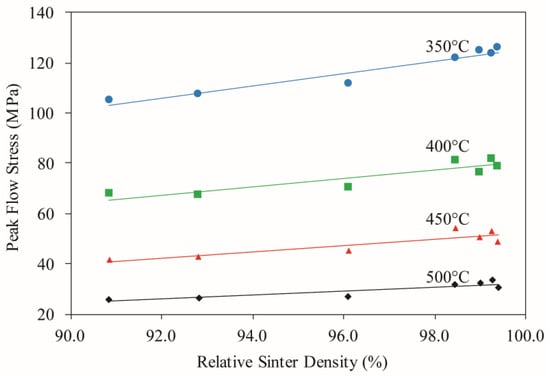 Effect of preform sintered density on the peak flow stress; samples deformed at a strain rate of 0.05 s−1 and temperatures 350 °C to 500 °C.