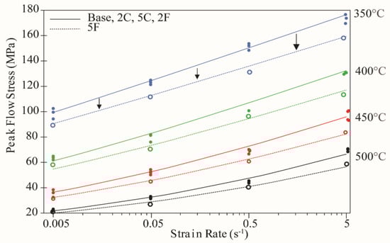 The peak flow stress behavior of the alloy as a function of ceramic content, TMP temperature, and strain rate are shown in Table 4. For a given temperature and strain rate, the peak flow stress values remained largely equivalent for all alloy compositions considered. Differences between compositions Base, 2C, 5C, and 2F were especially small. For example, at 400 °C and 0.500 s−1, the peak stress values only ranged from 100.7 MPa to 100.9 MPa while the average range for any set of TMP conditions was just 4.5 MPa. Interestingly, the 5F composition exhibited peak flow stresses distinct from the other compositions. Again at 400 °C and 0.500 s−1, this specific composition exhibited a peak flow stress of 96.3 MPa. The change in peak flow stress value for a given composition was influenced by both temperature and strain rate. A decrease in strain rate or an increase in temperature both corresponded to a decrease in flow stress. For the range of TMP conditions considered, the flow stress appears to be influenced more strongly by temperature.