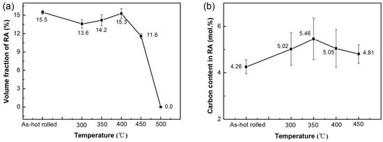 - When the tempering temperature was lower than 400 °C, the amount of RA decreased compared to the as-rolled rail due to the decomposition of austenite to bainite. At a middle tempering temperature of 400 °C, the RA was very stable during tempering. When the tempering temperature was 500 °C, a large amount of carbides precipitated and RA almost disappeared.