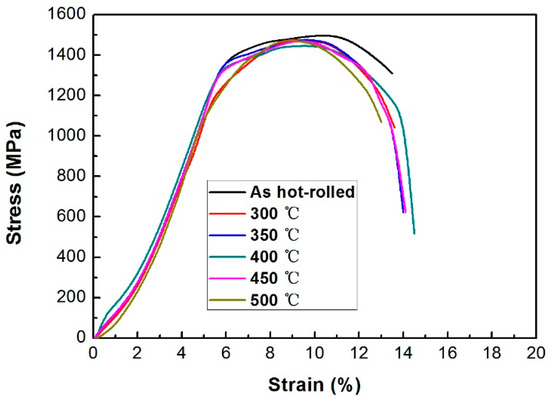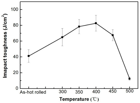 - The tensile strength of the rail head decreased when the tempering temperature was lower than 450 °C due to the decreased dislocation density and carbon content in bainite ferrite and the coarseness of bainite ferrite. Carbide precipitation compensated for the decrease in strength when the tempering temperature was 450 °C and 500 °C. In addition, the elongation slightly increased and impact toughness was obviously improved at the tempering temperature from 300 °C to 400 °C. The impact toughness and elongation sharply decreased after tempering at 500 °C because of the appearance of carbides and absence of RA. Therefore, RA plays a significant role in the toughness of bainite rail by the TRIP effect.