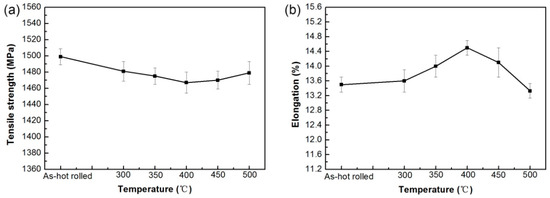 - Hasan, H.S.; Peet, M.J.; Avettand-Fènoël, M.N.; Bhadeshia, H.K.D.H. Effect of tempering upon the tensile properties of a nanostructured bainitic steel. Mater. Sci. Eng. A 2014, 615, 340–347. [Google Scholar] [CrossRef]