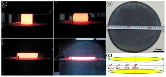 Preparation of the as forged composite pancake: (a) forging process; (b) macrograph of composite pancake; (c) schematic diagram showing the sampling points taken from the composite pancake.