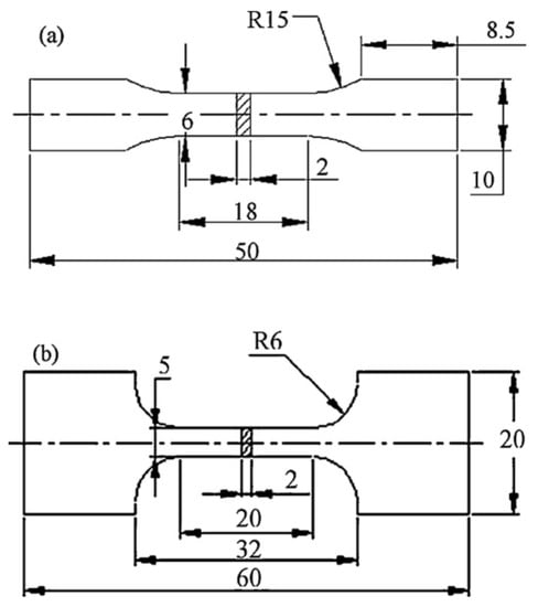 Dimensioned schematic of the tensile specimen: (a) room temperature specimen; (b) high temperature specimen. Note: all dimensions are in mm.