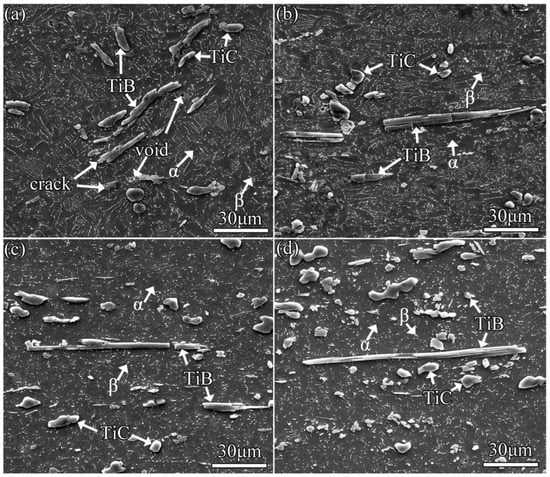 Due to the high elastic modulus, specific strength, superior creep and fatigue resistances, titanium matrix composites (TMCs) have been emerged as attractive candidate materials for high-temperature structural applications in aerospace and automotive industries [,,,]. As one approach for producing TMCs, in situ synthesis techniques have drawn extensive interest because of their superior properties along with the ease of fabrication [,,]. Among the reinforcements available for TMCs, TiB whiskers (TiBw) and TiC particles (TiCp) are the most suitable reinforcements since they possess high thermal stability, similar density and thermal expansion coefficient to titanium alloys, high modulus and stiffness [,,]. In recent years, several new processing techniques for synthesizing titanium MMCs have been developed; in particular, additive manufacturing has attracted increasing interest [,]. Some new titanium alloy MMCs are also being developed such as Ti-MMCs with carbon-based reinforcements [].
