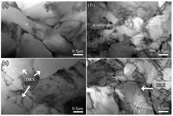 The TEM images in Figure 4 reveals the matrix microstructures of the (TiBw + TiCp)/Ti composite pancake. In the peripheral region, the predominant feature in the matrix microstructure is the fine α subgrains. Each α subgrain is surrounded by adjacent α subgrains, as shown in Figure 4a. In addition, it can be seen from Figure 4b that some α subgrains contain a large number of dislocations. The α subgrains are generally induced by dislocation recovery due to the high stored energy generated during forging. In contrast, in the centre area, some fine equiaxed DRX α grains can be clearly seen and the dislocations density appears to be much lower, as shown in Figure 4c,d.