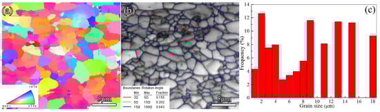 EBSD analyses of the matrix microstructure within the composite pancake: (a) IPF (inverse pole figure) map; (b) grain boundary map and (c) grain size distribution.