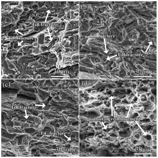 In order to illustrate the fracture characteristics of the 5 vol. % (TiBw + TiCp)/Ti composite pancake, tensile fracture surfaces of the centre area are taken as an example. As shown in Figure 6a, the cracked TiB whiskers and TiC particles surrounded by the ductile dimples are observed on the fracture surface. The fracture mode reveals the coexistence of brittle fracture and ductile fracture. It is evident that TiB whiskers and TiC particles embrittle the matrix, with the plastic deformation being very small. In addition, particle pull-out is seldom found on the fracture surface, indicating the good interfacial bonding between the reinforcements and matrix, when the sample is tested at room temperature. As the tensile temperature increases to 600 °C and 650 °C, no obvious changes can be noticed except more and deeper dimples in the matrix, as shown in Figure 6b,c. Therefore, there is no significant change in the fracture mechanism of the (TiBw + TiCp)/Ti composite when tested at room temperature to 650 °C. However, upon further increasing the temperature to 700 °C, there exist distinct features on the fracture surface compared to those found below 700 °C. It can be observed in Figure 6d that the dimples dominate the fracture surfaces, indicating the ductile failure at 700 °C. In addition, the pull-outs of TiB whiskers and TiC particles are seen in Figure 6d, implying that interfacial strength decreases and TiC particles detach from the matrix at the interface at 700 °C.