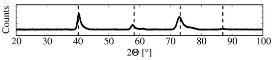 As seen in the cross section shown in Figure 1a, a crystal structure with elongated submicron grains forms. This structure is due to a defined growth direction during sputtering, and is in agreement with literature expectations for the selected process parameters [41]. The crystal is therefore anisotropic and the relative intensities of peaks in the XRD should not be compared to literature of isotropic materials.
