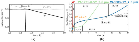 In the next step, mass gain due to oxidation is investigated. The mass change with respect to time of W, W-Cr, and W-Cr-Y is shown in Figure 3b. Pure W exhibits fast linear mass gain at a rate of . Binary W-Cr alloys show parabolic behavior with a rate of , reducing to a minimum gradient of . After the film detaches from the substrate, indicating complete failure of the protective function. The oxidation process of the W-Cr-Y films can be separated into three stages: