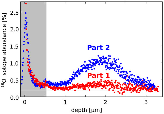 The following description of Figure 5 starts with part 1 of the experiment at the surface of the sample, : 18O exhibits a maximum abundance at the surface of the oxide layer and gradually decreases with higher depth. At a depth of around , the 18O abundance slightly increases again to a local maximum at a depth of around . An increase of abundance does not necessary mean an increase of the absolute amount of O. The increase is only around , thus part 2 is described before drawing conclusions.