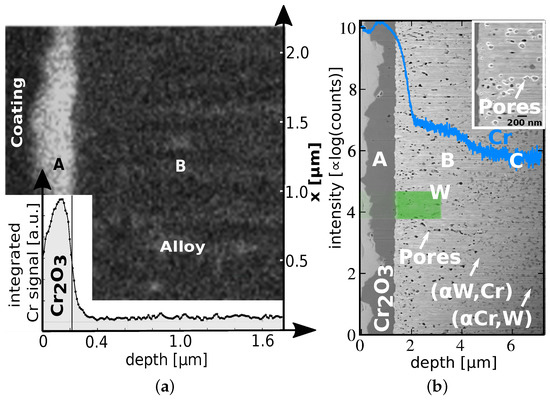 (a) Map of the chromium concentration measured with EDX on the W-12Cr-0.5Y sample shown in Figure 4b. The intensity signal was based on the Cr lines. The inset is derived by integration of the intensity over x. The regions of the oxide and the alloy are labeled A and B, respectively; (b) Electron microscopy image of a cross section of a thick () W-13Cr-1Y alloy. It was exposed to a temperature of at O2 and Ar partial pressure for . Overlayed are the corresponding Cr-profile measured using SIMS and an EDX map of W based on the W line. The image in the inset has an increased magnification and shows the pores more clearly.