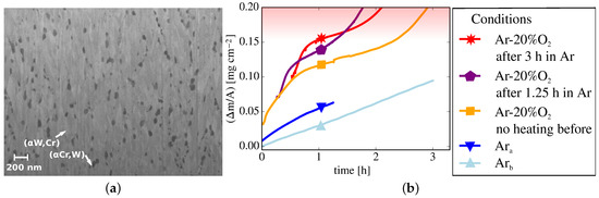 A dedicated experiment (see Figure 7b) separates the effects of phase formation and of oxidation: W-Cr-Y samples with a thickness of are heated in Ar atmosphere at for and . The Ar atmosphere during baking is obtained by nine times flushing with pure Ar followed by evacuation of the furnace to a minimum pressure of , labeled as , or , labeled as . Thus, the residual oxygen level is different in and . The residual oxygen causes slow mass gain due to oxidation during baking. The SEM image in Figure 7a shows the formation of a Cr-rich phase after the annealing step. The darker regions belong to the (Cr, W) phase, whereas the brighter regions are identified as (W, Cr) phase. The samples are then oxidized at in O2 and Ar partial pressure. The mass gain characteristics of the alloy without heating prior to oxidation are explained in Section 4.1, here it is shown as a reference. The mass gain due to oxidation of the alloys after baking includes the mass gain during baking. The starting time of the curves is shifted so that the curves start on the reference measurement. After and after of heating, the three stages of oxidation are still observed and no clear effect on the oxidation behavior is found. In all cases the transition to oxidation stage 3 occurs at a mass gain above ~—this part is shaded in Figure 7b.