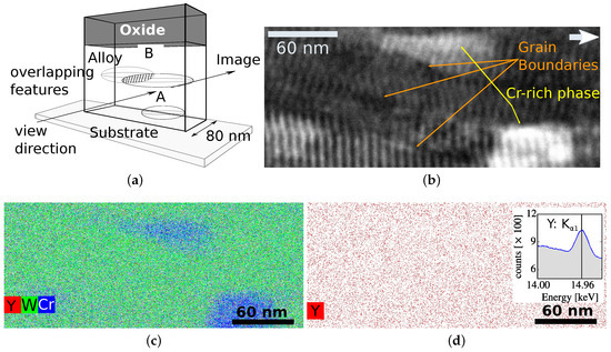 The bottom half of the sample, region A in Figure 8a, is shown in Figure 8b–d. The electron image, Figure 8b, exhibits a regular pattern, indicating a variation of concentration parallel to the surface. The periodicity of correlates to the rotation speed of the stage in the magnetron, during every turn of the stage ~ of material are deposited. Further, grain boundaries and grains with different contrast are shown in Figure 8. The information obtained in the EDX-measurement, Figure 8c, prove that the three bright spots have a higher Cr content than the other grains. Consequently the other grains are referred as Cr-poor phase. The spectrum in the inset of Figure 8d shows a peak at the -line of Y. This peak proves that Y is detected. The mapping, Figure 8d, shows atomically dispersed yttria within the observed region, no yttria particles are resolved.