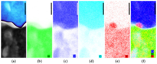 STEM measurement in region B from Figure 8a. The alloy W-12Cr-0.5Y is oxidized at a temperature of at O2 and Ar partial pressure for . The scale-bar in the top right corner has a length of for all images. (a) Electron image using two different color maps: One for the Cr2O3 layer and one for the alloy; EDX map measurements of (b) tungsten; (c) chromium; (d) oxygen; and (e) yttrium; (f) Overlay of images (b,c,e). These data were already briefly introduced in ref. [17].