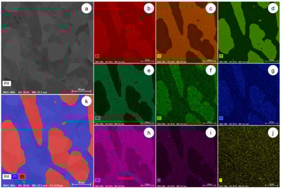 The representative distribution maps of alloying elements and phases in the as-received UNS S32750 SDSS alloy: (a) the microstructure of the analysed field; (b) the SEM-EDS distribution of Fe; (c) the SEM-EDS distribution of Cr; (d) the SEM-EDS distribution of Ni; (e) the SEM-EDS distribution of Mo; (f) the SEM-EDS distribution of Cu; (g) the SEM-EDS distribution of W; (h) the SEM-EDS distribution of Mn; (i) the SEM-EDS distribution of Si; (j) the SEM-EDS distribution of V; (k) the computed distribution of phases in the microstructure of the analysed field.