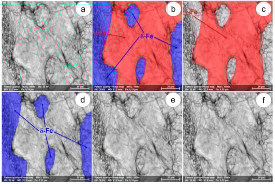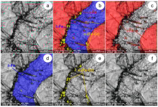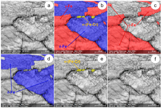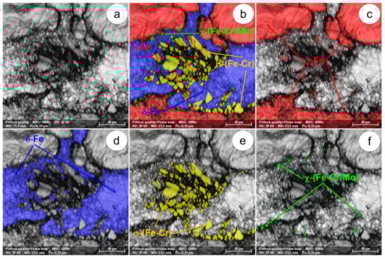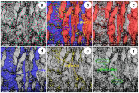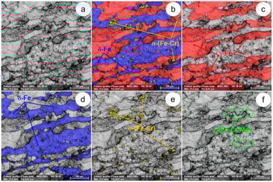The SEM-EBSD composite images (×1000) obtained after forging at 850 °C: (a) microstructure of the analysed field; (b) the distribution of existing phases in the microstructure of the analysed field; (c) the distribution of the γ-Fe phase; (d) the distribution of the δ-Fe phase; (e) the distribution of the σ-(Fe-Cr) phase; (f) the distribution of the χ-(Fe-Cr-Mo) phase.