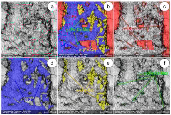The SEM-EBSD composite images (×1000) obtained after forging at 1000 °C: (a) the microstructure of the analysed field; (b) the distribution of existing phases in the microstructure of the analysed field; (c) the distribution of the γ-Fe phase; (d) the distribution of the δ-Fe phase; (e) the distribution of the σ-(Fe-Cr) phase; (f) the distribution of the χ-(Fe-Cr-Mo) phase.