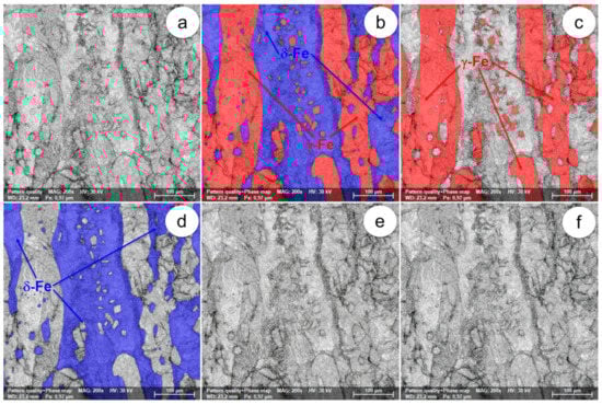 The SEM-EBSD composite images (×200) obtained after forging at 1000 °C: (a) the microstructure of the analysed field; (b) the distribution of existing phases in the microstructure of the analysed field; (c) the distribution of the γ-Fe phase; (d) the distribution of the δ-Fe phase; (e) the distribution of the σ-(Fe-Cr) phase; (f) the distribution of the χ-(Fe-Cr-Mo) phase.