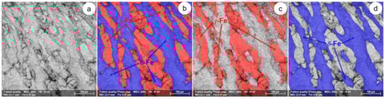 The SEM-EBSD composite images (×200) for the as-received UNS S32750 SDSS alloy (the initial microstructural state): (a) the microstructure of the analysed field; (b) the distribution of phases in the microstructure of the analysed field; (c) the distribution of the γ-Fe phase; (d) the distribution of the δ-Fe phase.