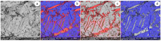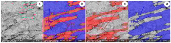 The SEM-EBSD composite images (×200) obtained after forging at 1200 °C: (a) the microstructure of the analysed field; (b) the distribution of existing phases in the microstructure of the analysed field; (c) the distribution of the γ-Fe phase; (d) the distribution of the δ-Fe phase.