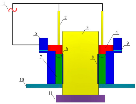 Schematic diagram of an electroslag remelting cladding (ESRC) device. 1-electrical source, 2-electrode, 3-mandrel, 4-liquid slag, 5-current carrying mold, 6-melting steel, 7-working layer, 8-fusion layer, 9-insulation layer; 10-based plate; 11-pulling device.