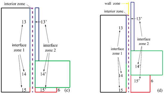 The dynamic mesh technique was employed to simulate the downward movement relative to the slag pool (D) of the compound roll including the mandrel (A) and the working layer (E). The mandrel-air (13), mandrel-slag (14) and mandrel-ingot (15) boundaries are set as the sliding interface to avoid grid errors in the withdrawal process. In Figure 2c the mandrel, air, slag pool and ingot are stationary at initial state. The interior zone is produced where the interface zone 1 and interface zone 2 overlap. When the mandrel slides downward relative to the air and slag pool, the interface zone 1 that comprise the boundary (13~15) extends beyond the interface zone 2. Meanwhile, additional wall zone for the portions of the boundary is created in Figure 2d by default [16]. The flux of the overlapping intersection between two interface zones can be computed through an interior zone. The boundary can also be set as coupled where interior zone exists. The flux and convection can be used for wall zone.